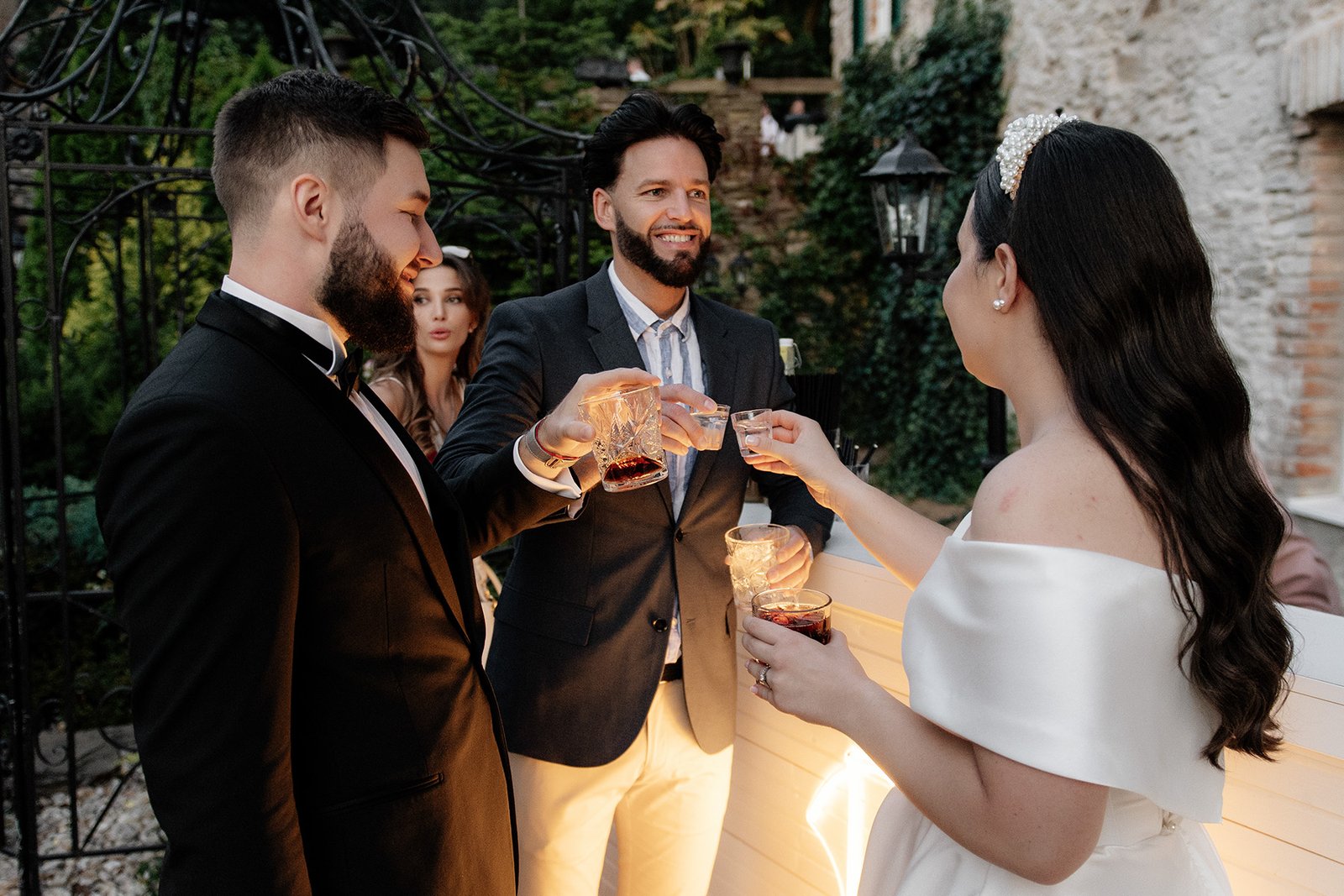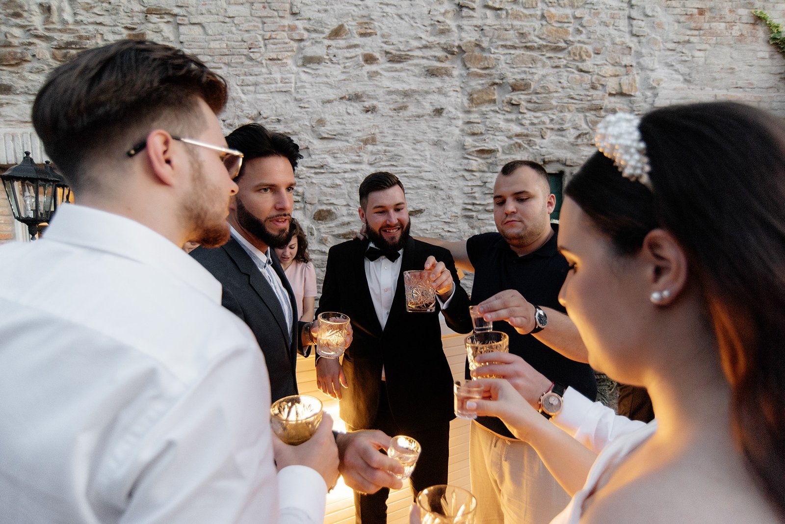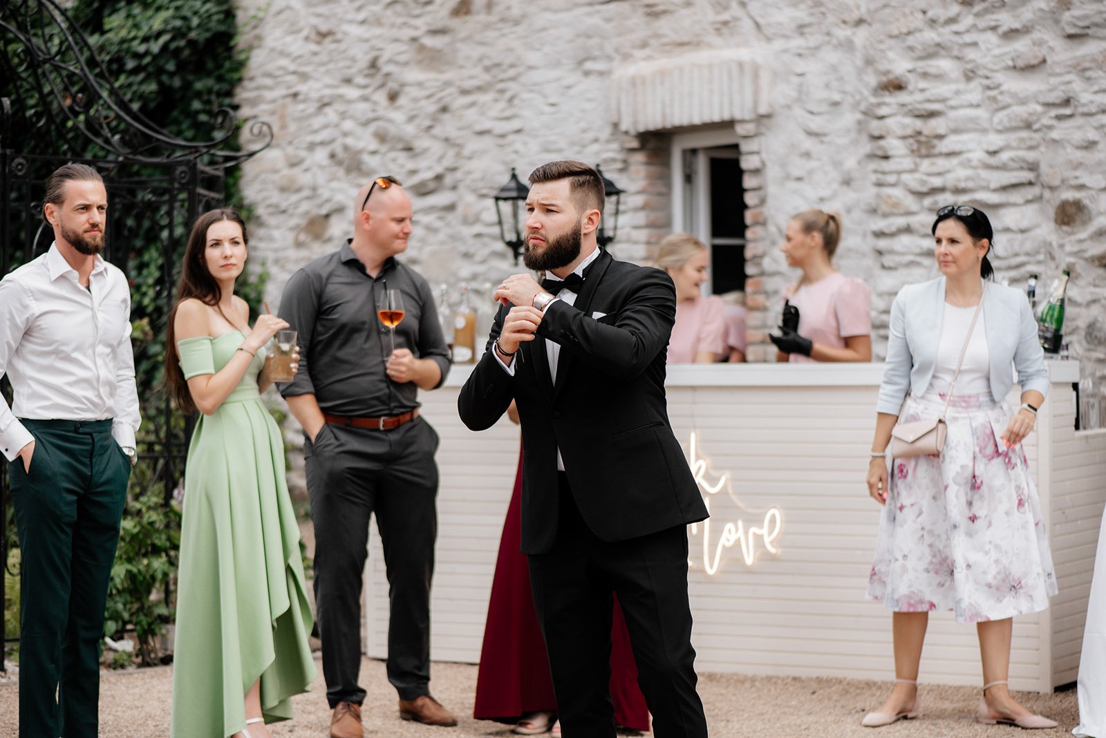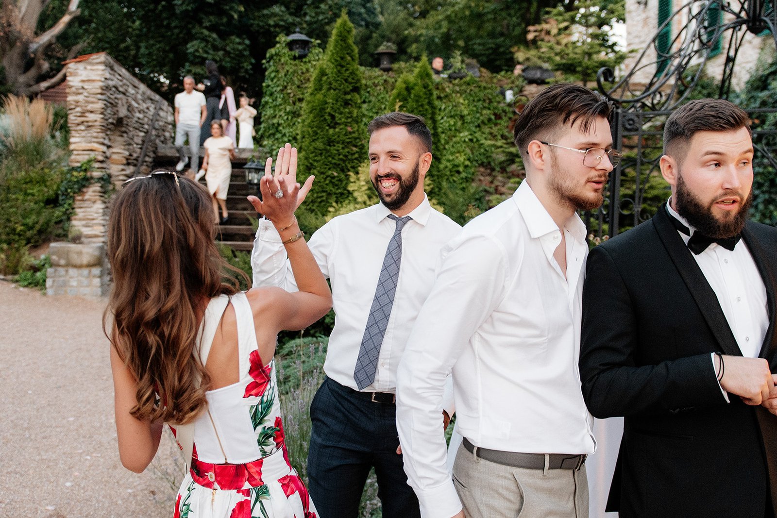 Po oficjalnej części goście zostali zaproszeni na elegancki furszet w ogrodzie. Stoły pełne smakowitych dań, rozmowy i śmiech – to wszystko tworzyło niepowtarzalny klimat tej uroczystości. Uwielbiam rejestrować takie momenty, gdy ludzie mogą cieszyć się sobą i celebrować miłość nowożeńców.
