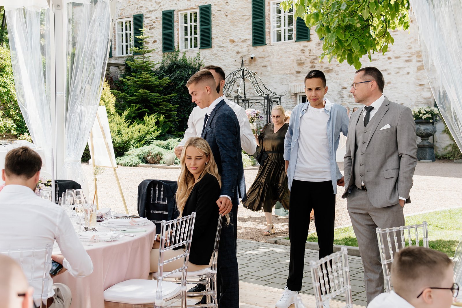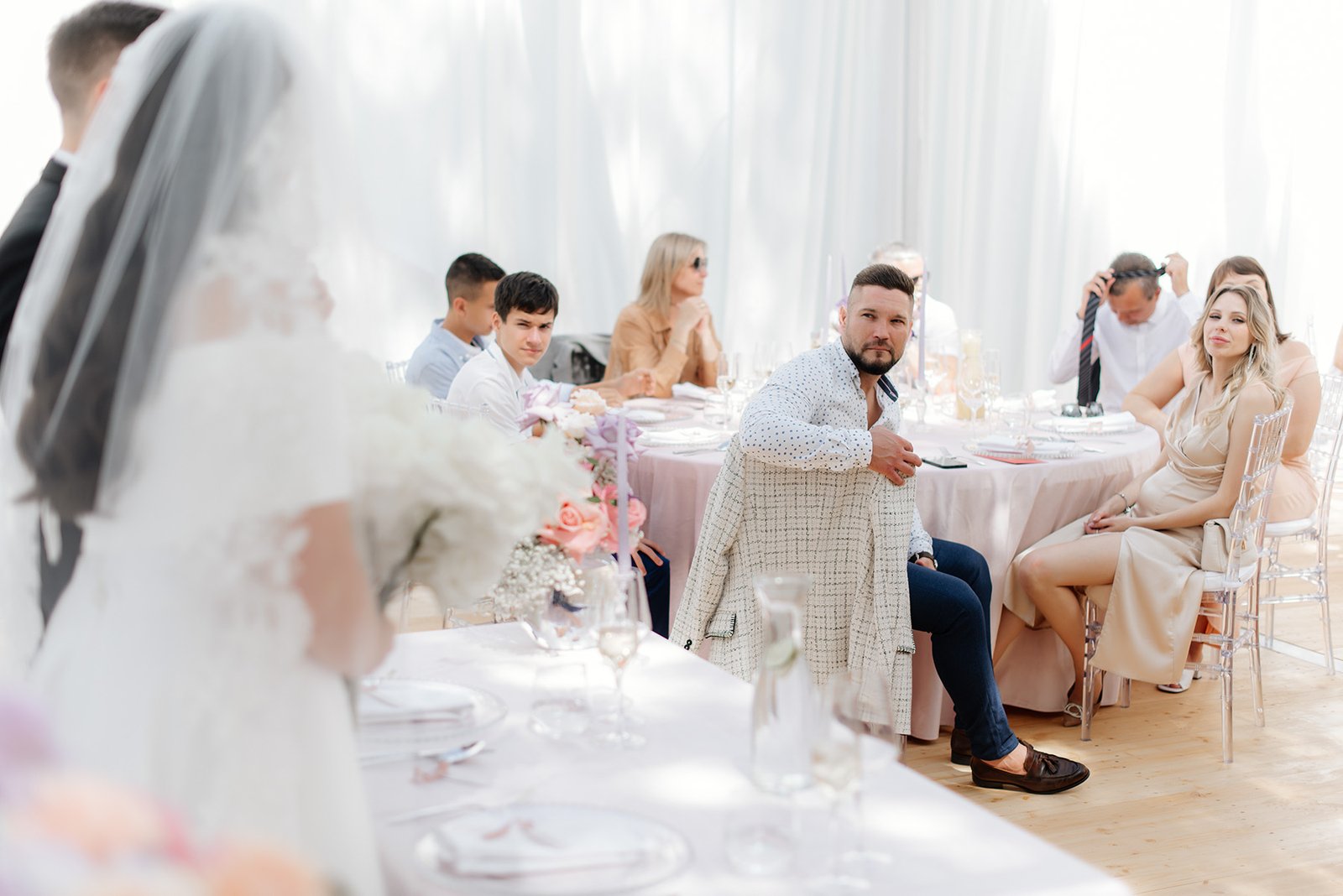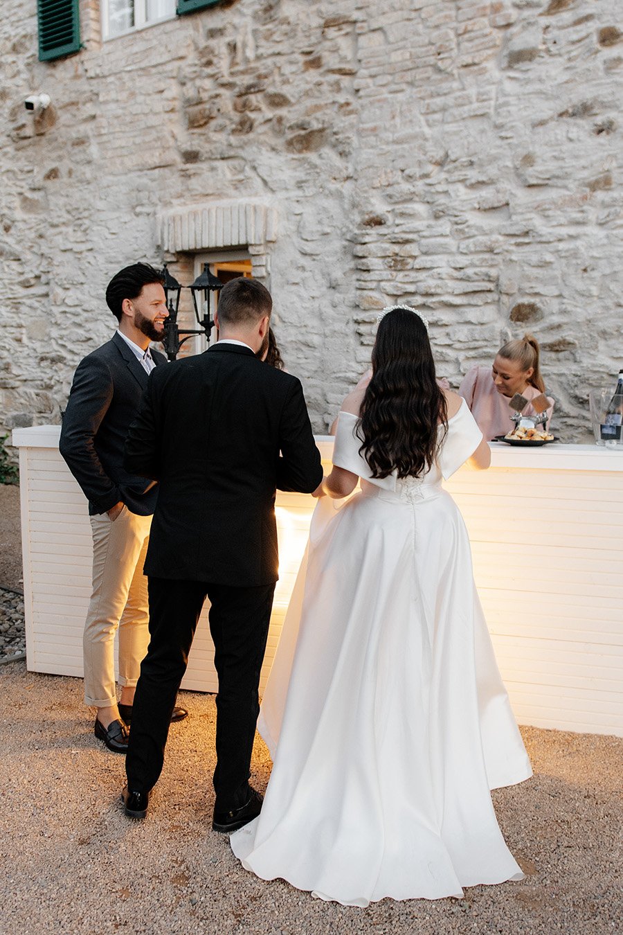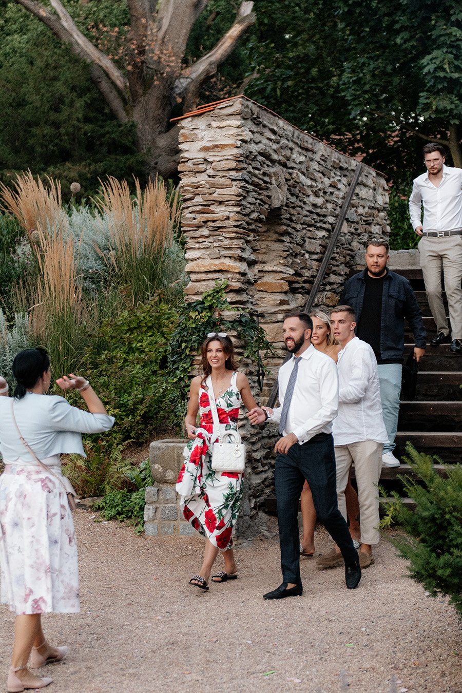 Po oficjalnej części goście zostali zaproszeni na elegancki furszet w ogrodzie. Stoły pełne smakowitych dań, rozmowy i śmiech – to wszystko tworzyło niepowtarzalny klimat tej uroczystości. Uwielbiam rejestrować takie momenty, gdy ludzie mogą cieszyć się sobą i celebrować miłość nowożeńców.