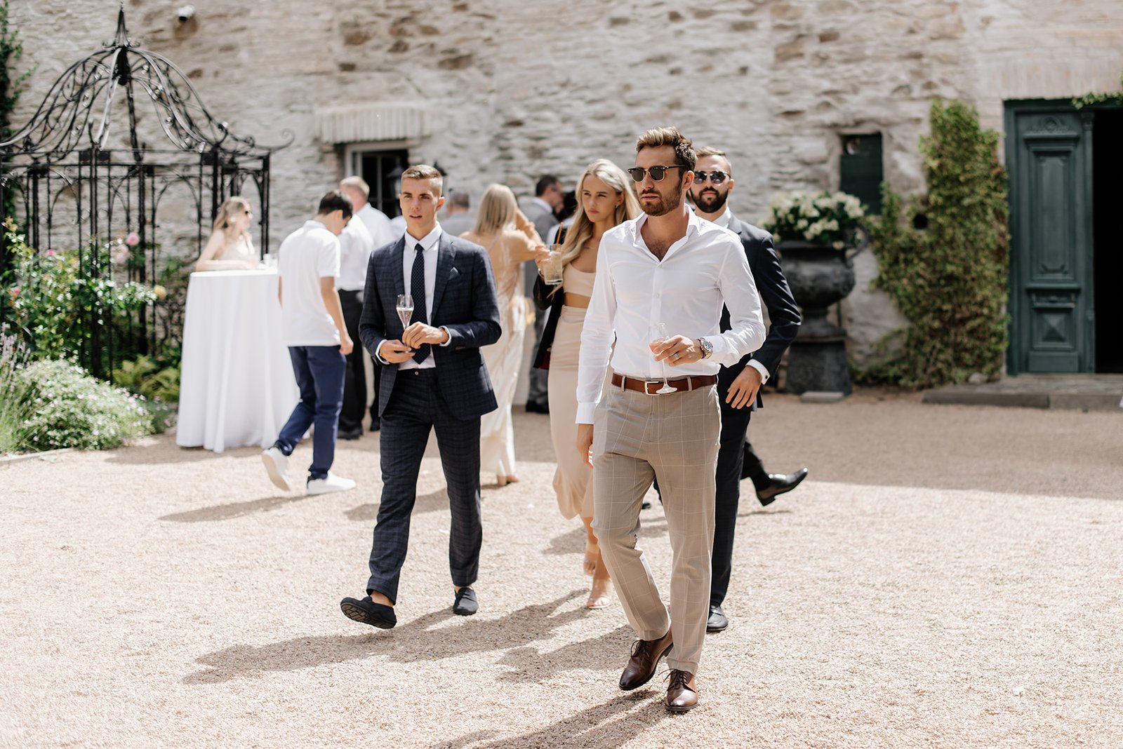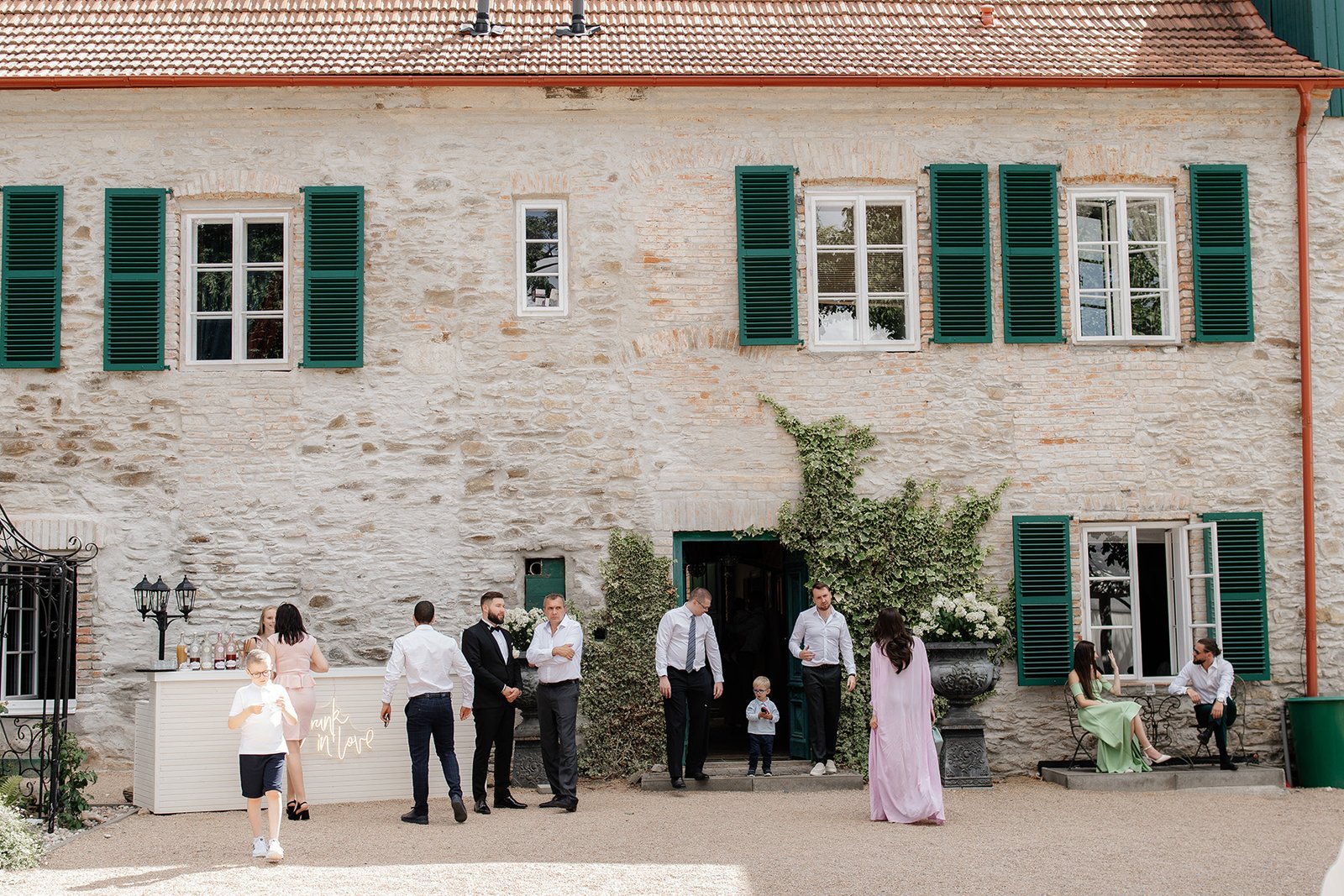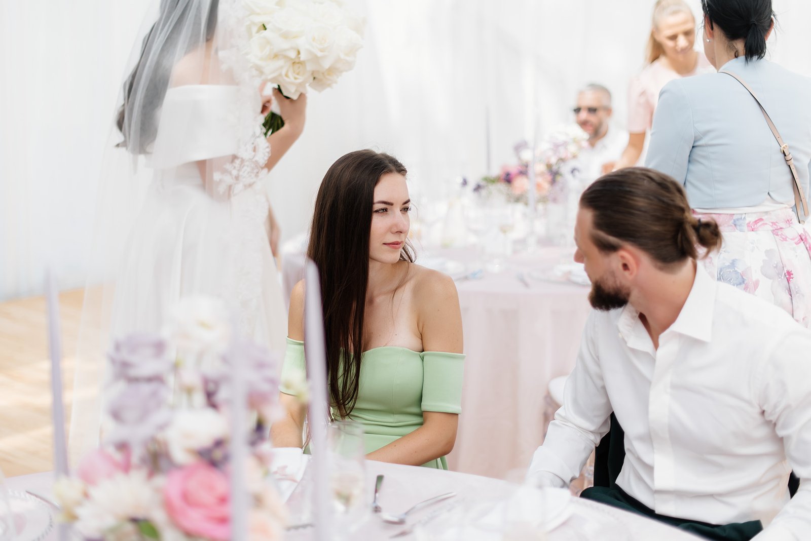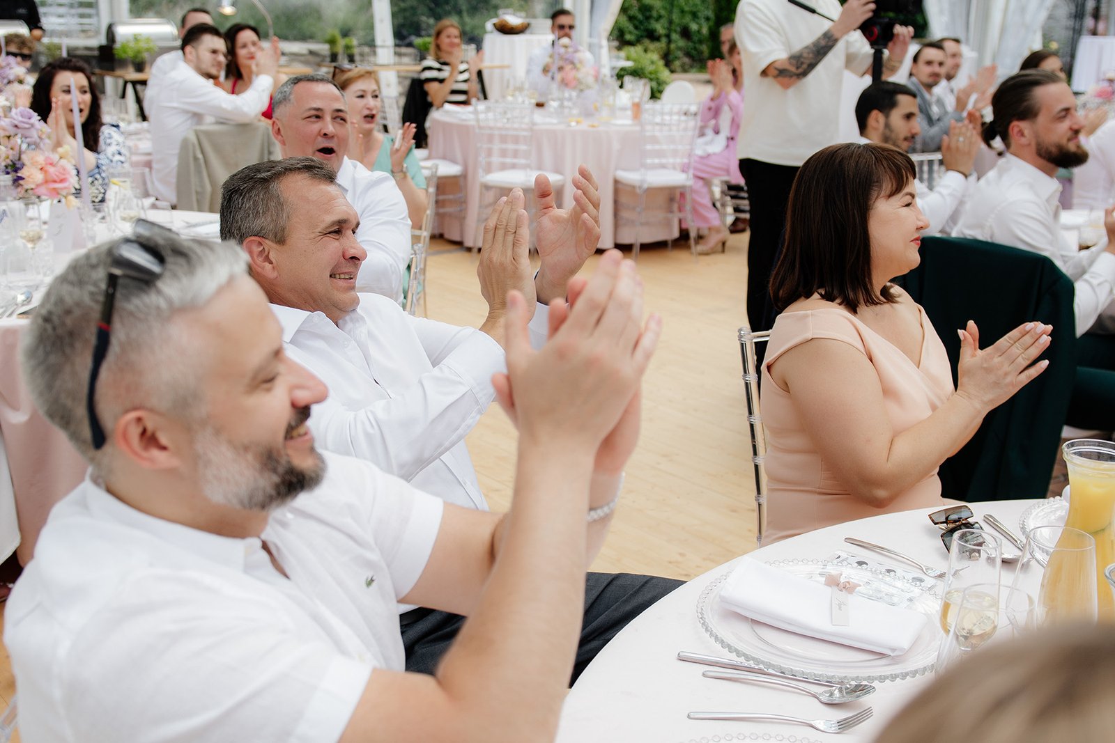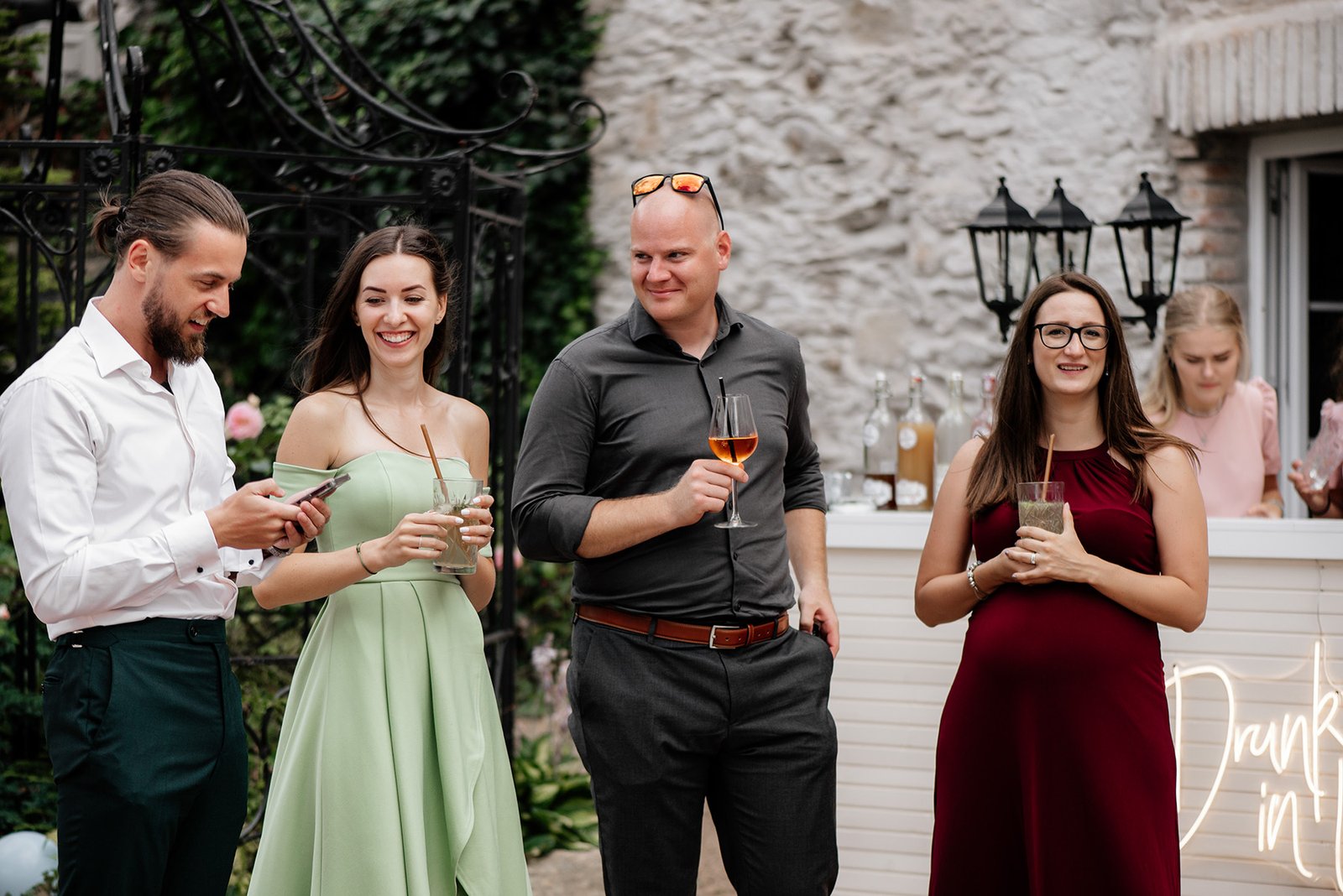 Po oficjalnej części goście zostali zaproszeni na elegancki furszet w ogrodzie. Stoły pełne smakowitych dań, rozmowy i śmiech – to wszystko tworzyło niepowtarzalny klimat tej uroczystości. Uwielbiam rejestrować takie momenty, gdy ludzie mogą cieszyć się sobą i celebrować miłość nowożeńców.