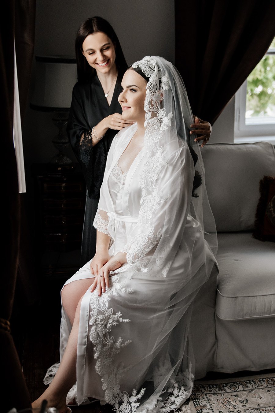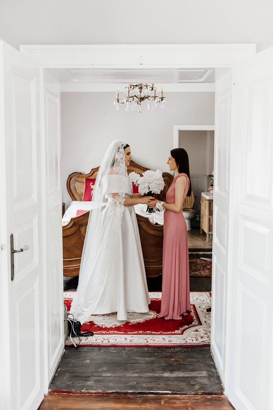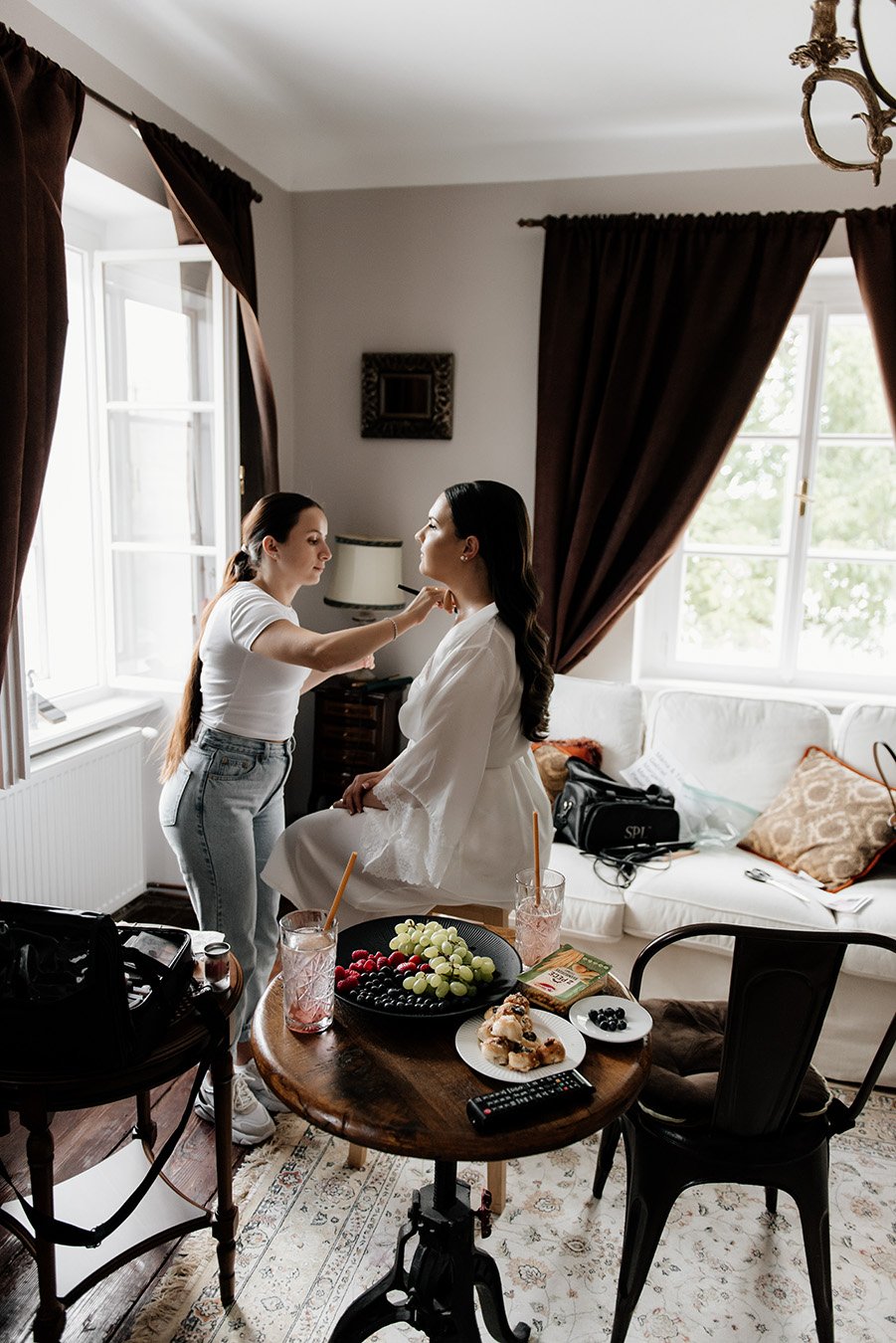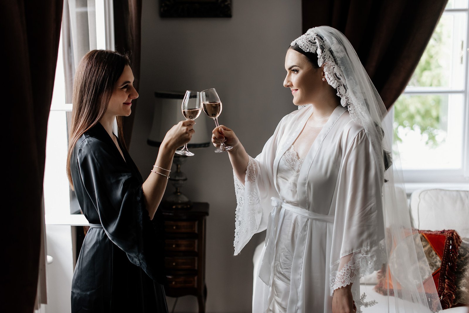Zawsze cenię szczególne chwile przed ceremonią. Kristina otoczona druhnami przygotowywała się w eleganckim apartamencie, gdzie panowała radosna atmosfera. W jej oczach widać było ekscytację i wzruszenie. Fryzjerka i makijażystka dbały o każdy detal, aby podkreślić jej naturalne piękno. Suknia ślubna wisiała na wieszaku, czekając na ten podniosły moment.