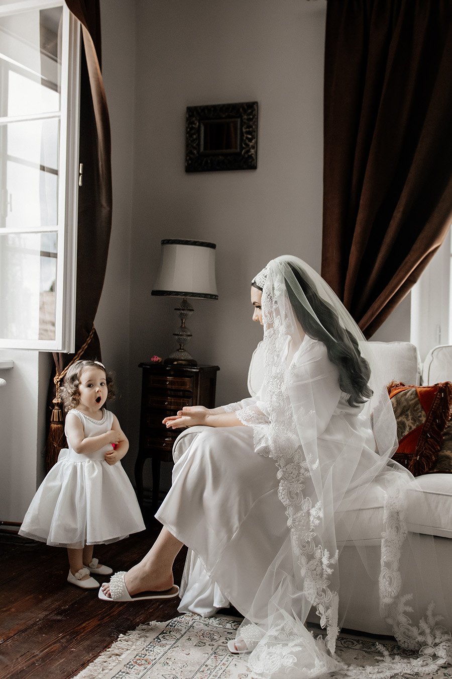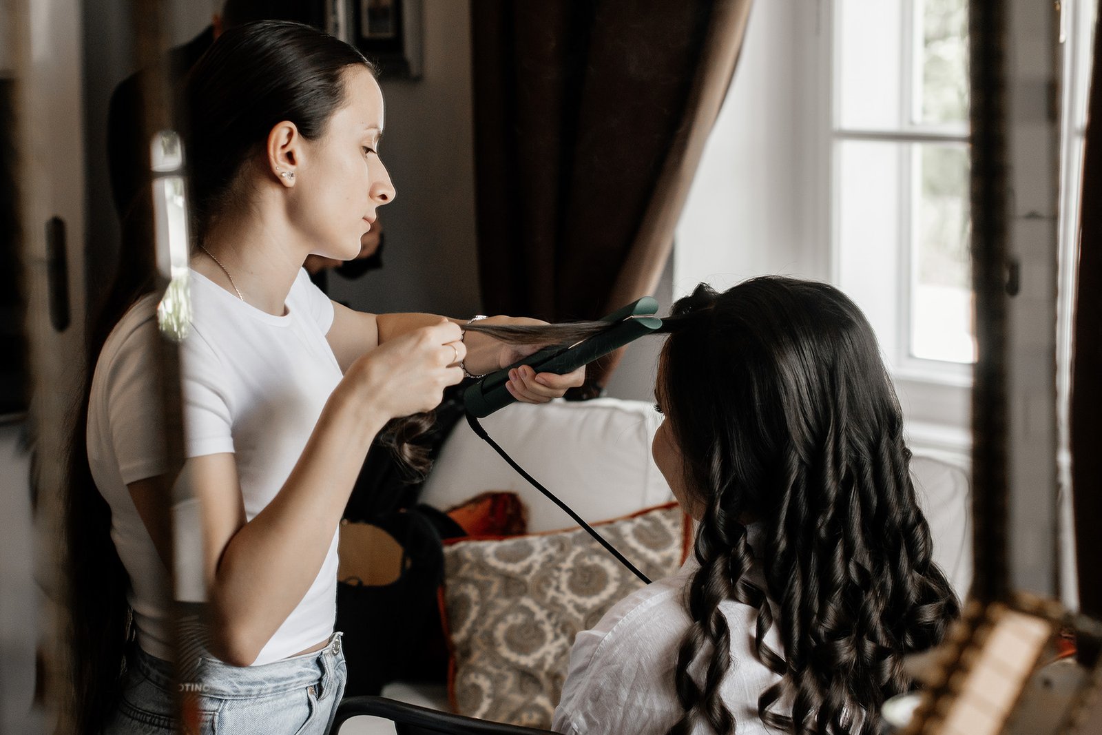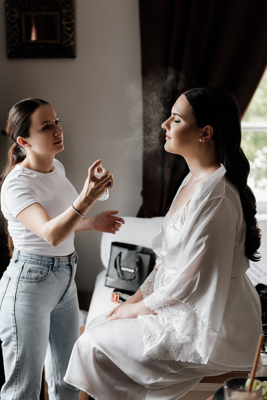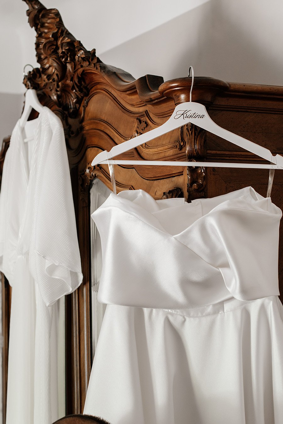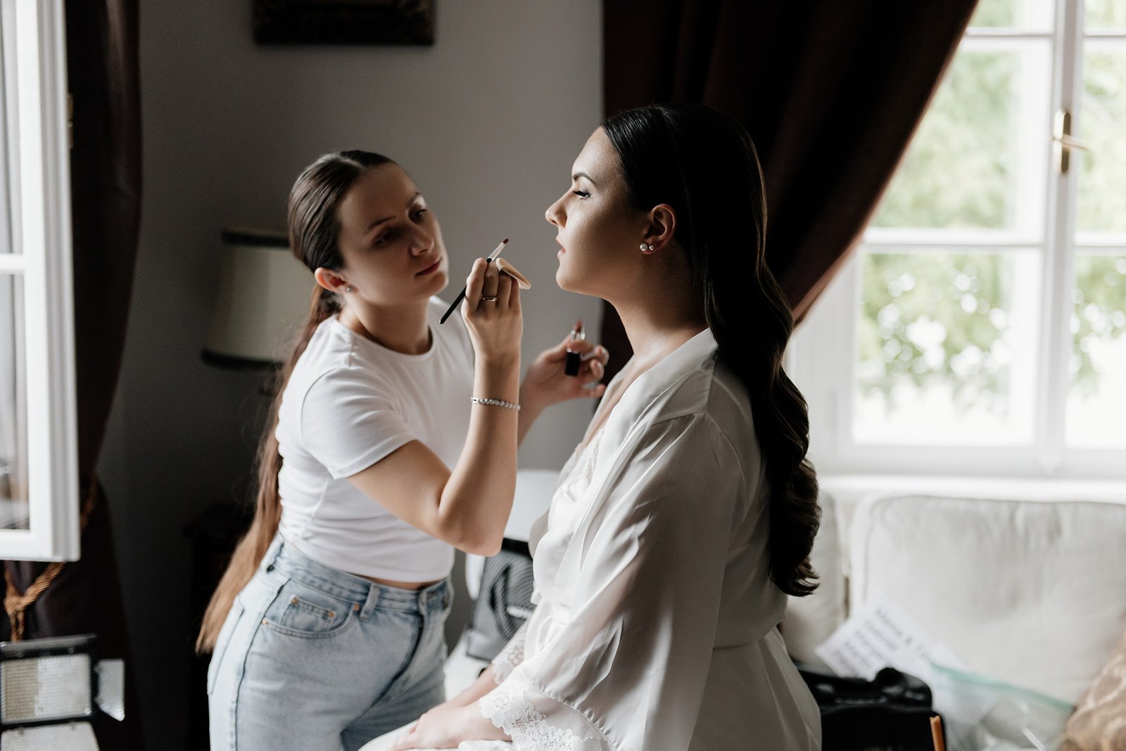 Zawsze cenię szczególne chwile przed ceremonią. Kristina otoczona druhnami przygotowywała się w eleganckim apartamencie, gdzie panowała radosna atmosfera. W jej oczach widać było ekscytację i wzruszenie. Fryzjerka i makijażystka dbały o każdy detal, aby podkreślić jej naturalne piękno. Suknia ślubna wisiała na wieszaku, czekając na ten podniosły moment.
