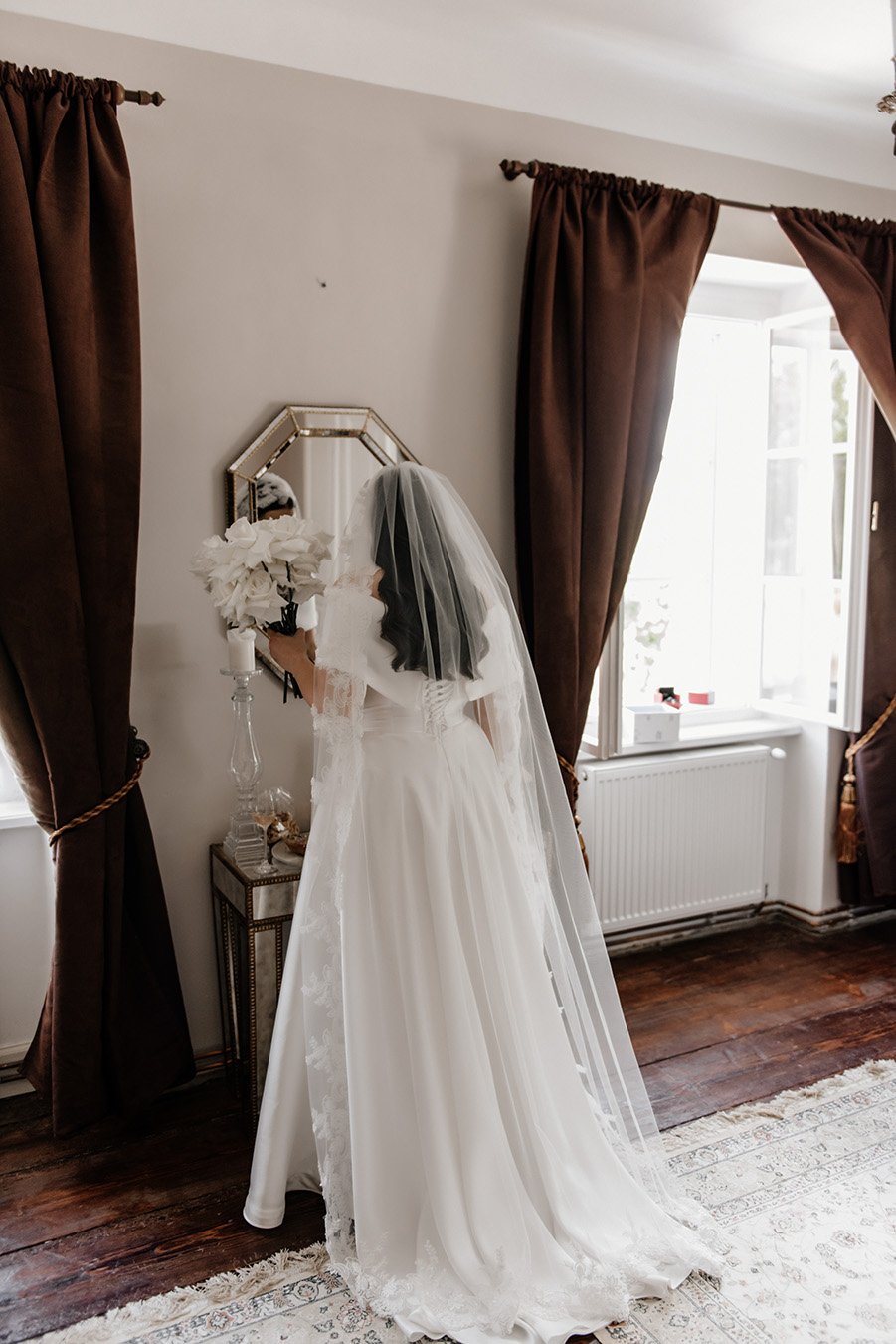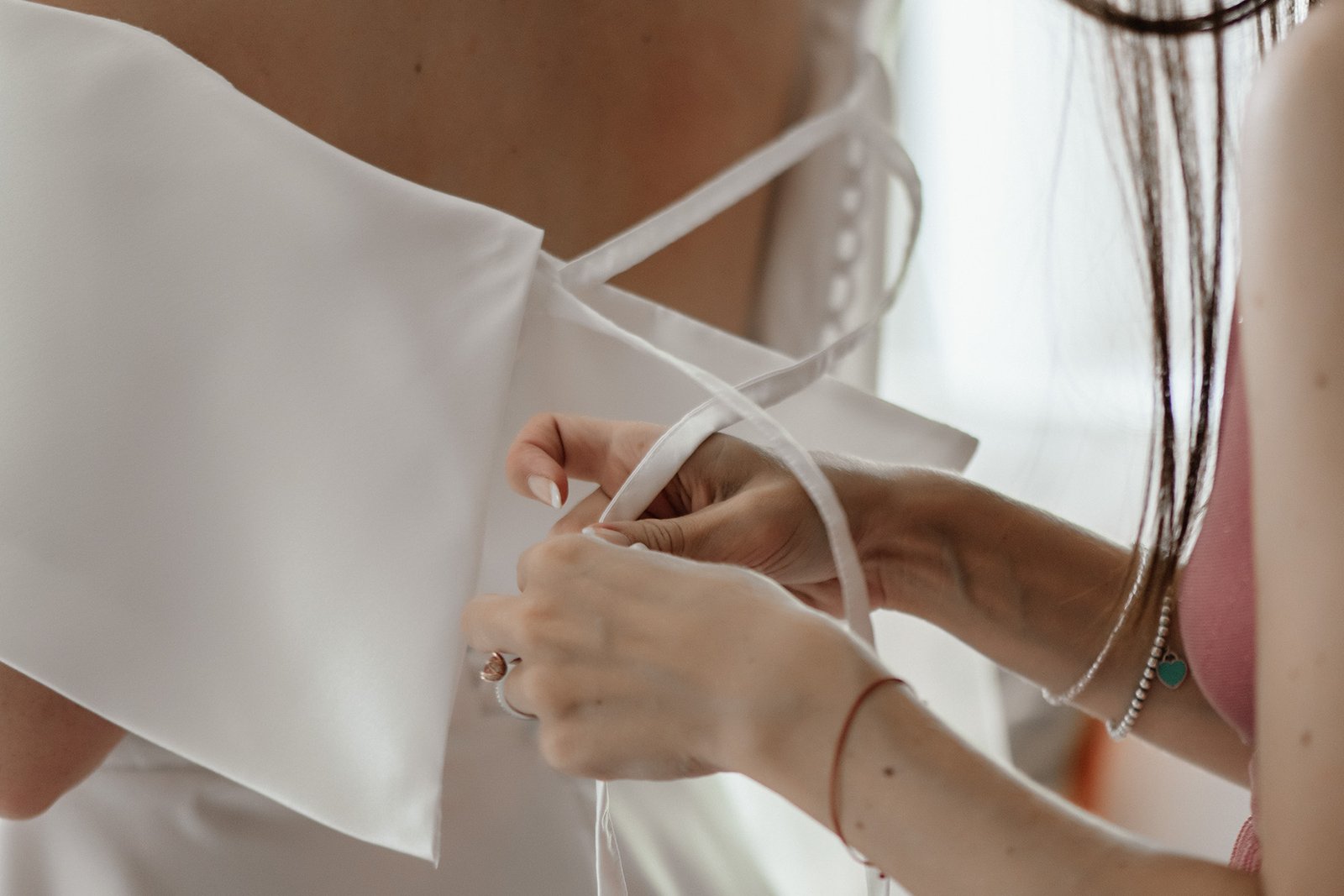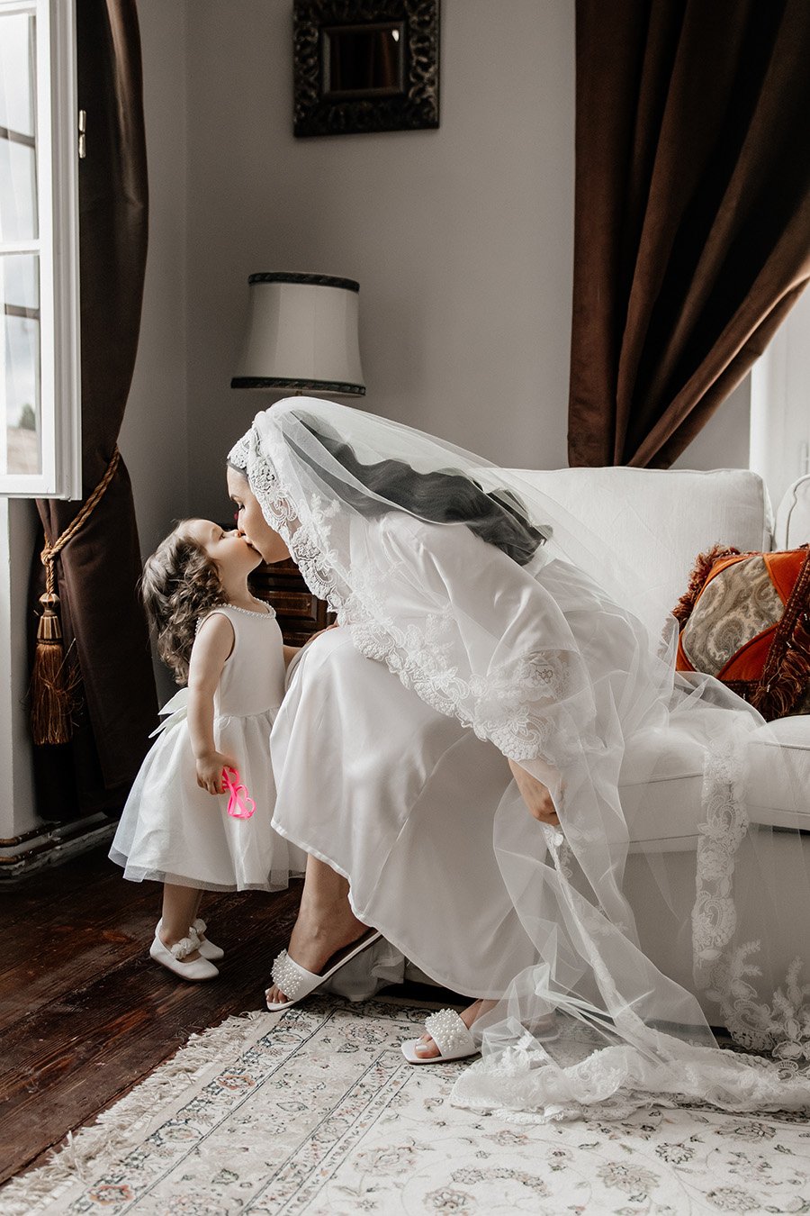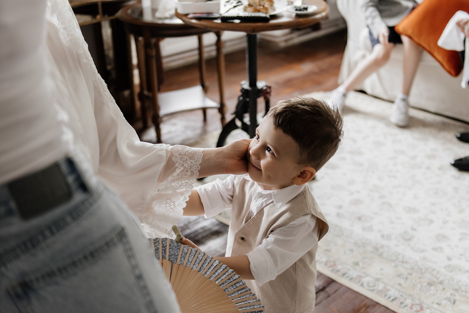 Zawsze cenię szczególne chwile przed ceremonią. Kristina otoczona druhnami przygotowywała się w eleganckim apartamencie, gdzie panowała radosna atmosfera. W jej oczach widać było ekscytację i wzruszenie. Fryzjerka i makijażystka dbały o każdy detal, aby podkreślić jej naturalne piękno. Suknia ślubna wisiała na wieszaku, czekając na ten podniosły moment.