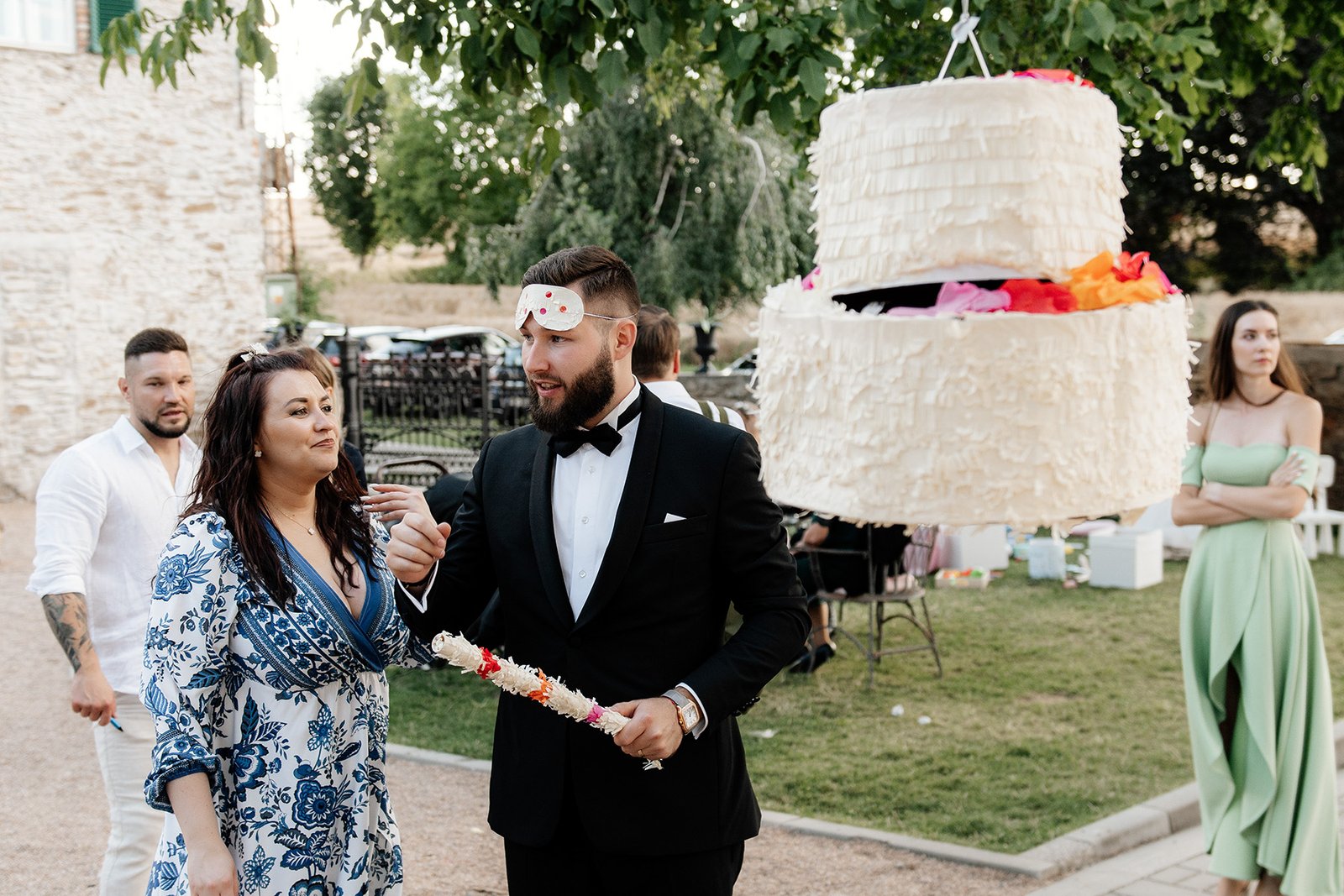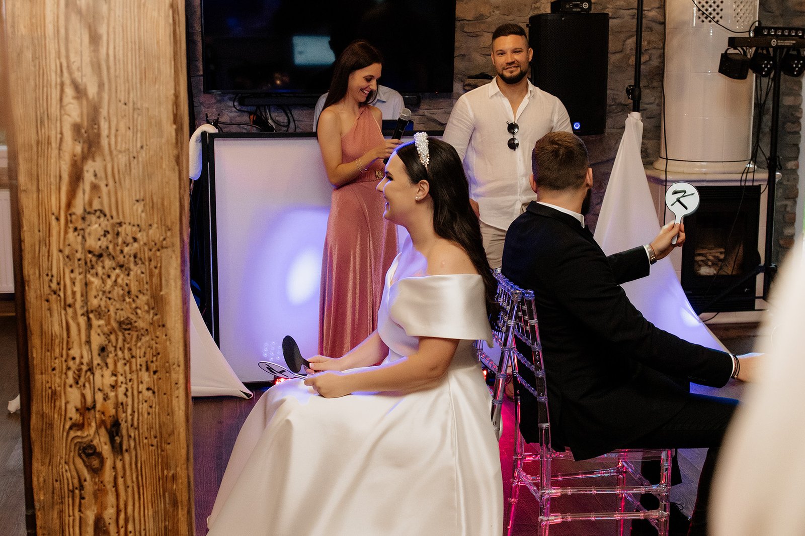 Jednym z najpiękniejszych momentów podczas wesela było rozkrojenie tortu ślubnego. Kristina i David razem, z uśmiechami na twarzach, podeszli do stołu, by wspólnie przeciąć pierwszą porcję tego przepysznego wypieku. To symboliczny gest, który nie tylko oznacza początek nowego rozdziału w ich życiu, ale także stanowi doskonałą okazję do uchwycenia chwil pełnych miłości i radości. Goście z niecierpliwością czekali na ten moment, a młoda para, karmiąc się nawzajem, wywołała salwy śmiechu i oklaski
