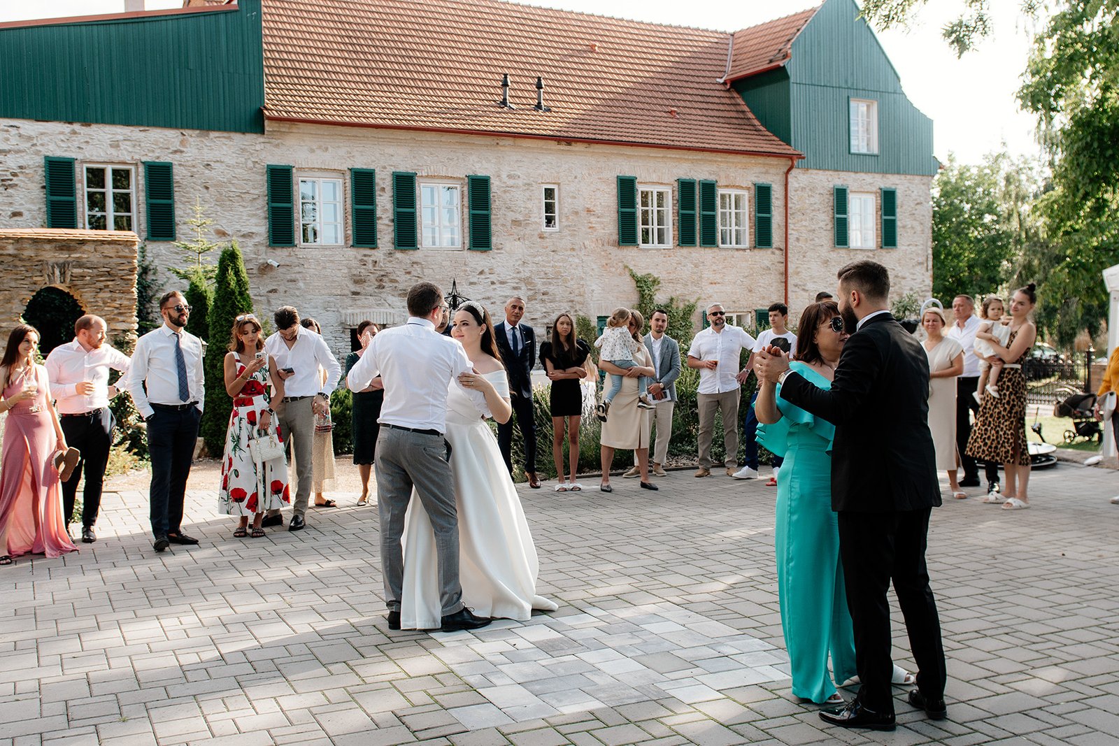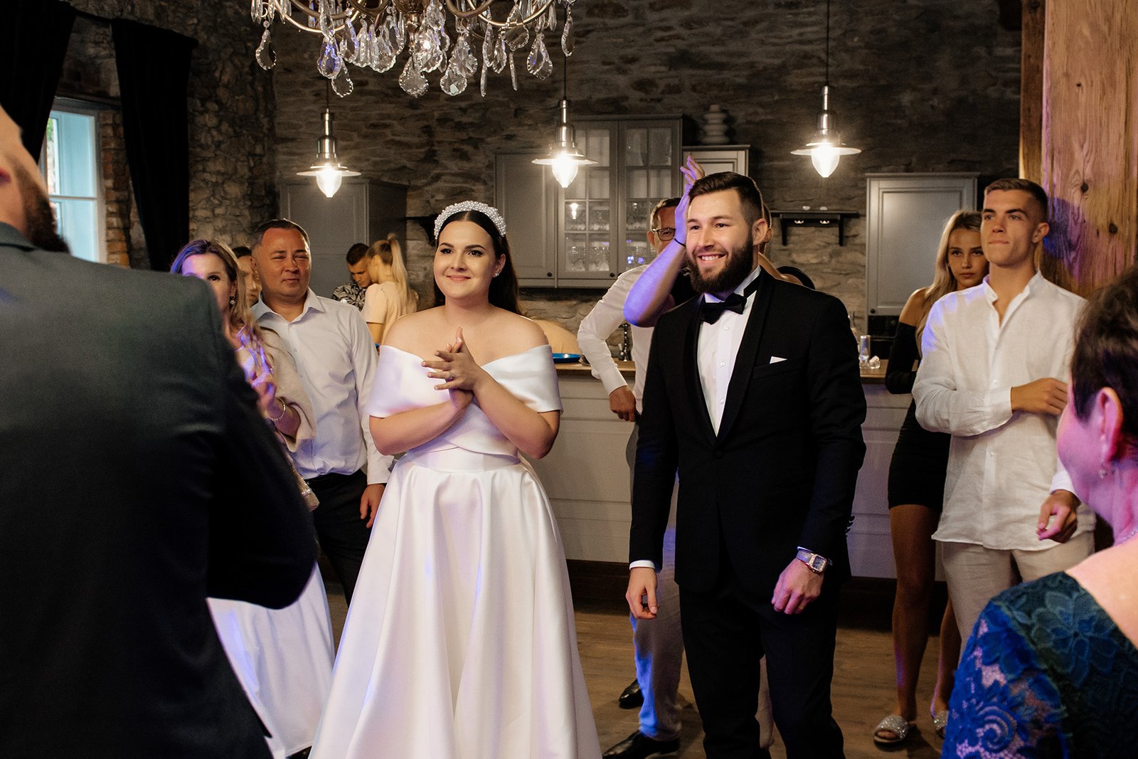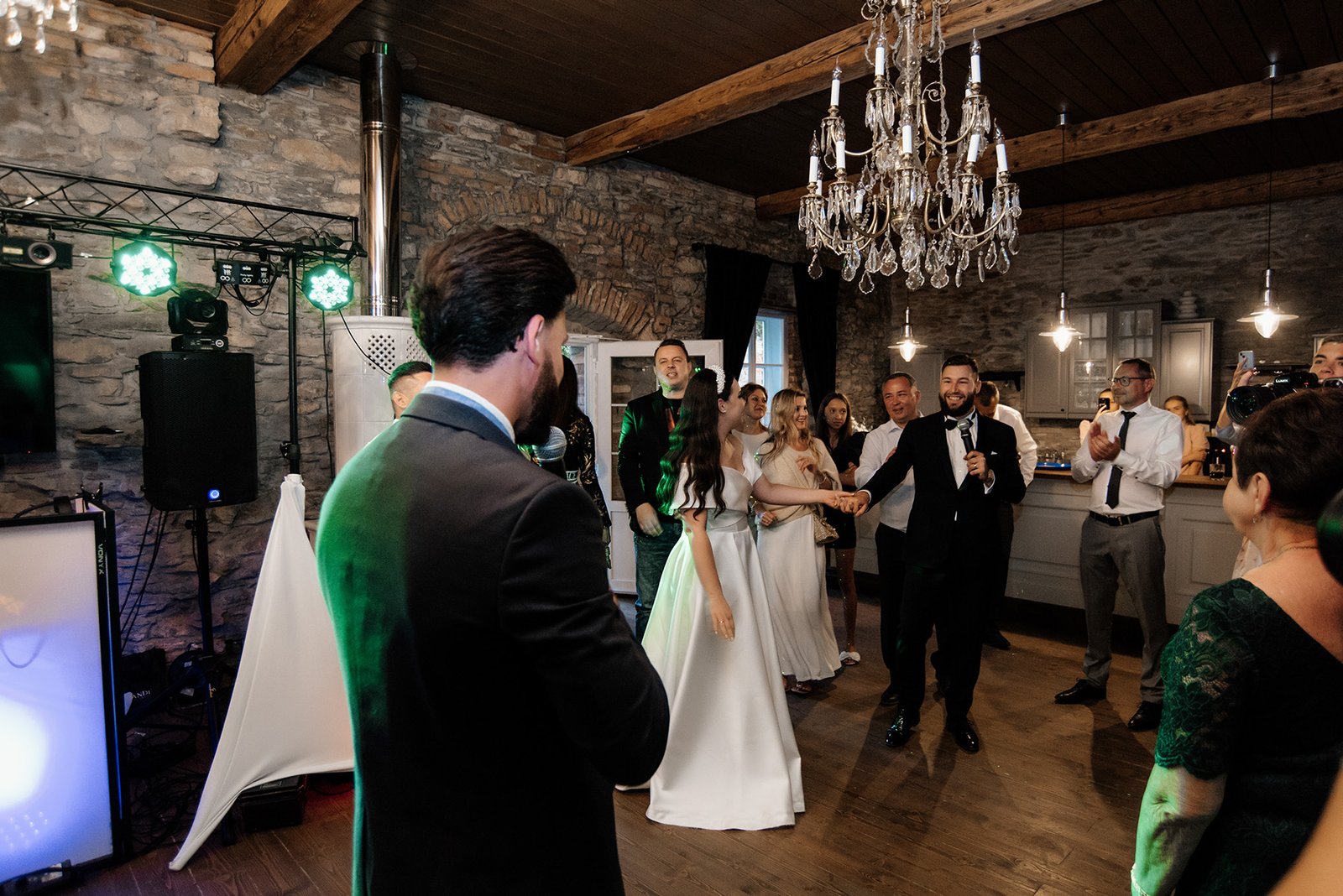 Po pierwszym tańcu Kristiny i Davida, nadszedł czas na kolejne wzruszające chwile. David zaprosił swoją mamę na parkiet, a Kristina ujęła za rękę swojego ojca, by wspólnie zatańczyć w tym wyjątkowym dniu. Był to moment pełen emocji, kiedy rodzice dzielili się radością z dziećmi, a goście obserwowali ten wzruszający gest z uśmiechami na twarzach. Po chwili do pary dołączyli wszyscy goście, tworząc radosną atmosferę na parkiecie. Tańczyli razem, śmiejąc się i ciesząc się każdą chwilą, a cała sala rozbłysła energią i radością, tworząc niezapomnianą atmosferę na zakończenie tej pięknej nocy.