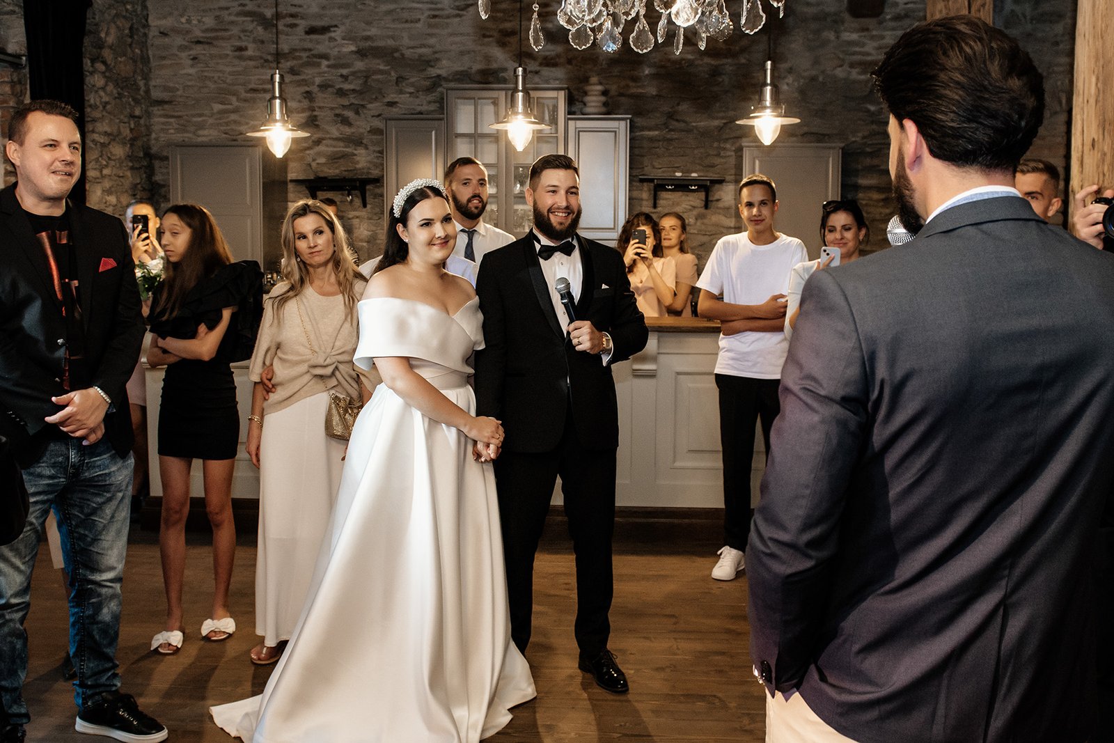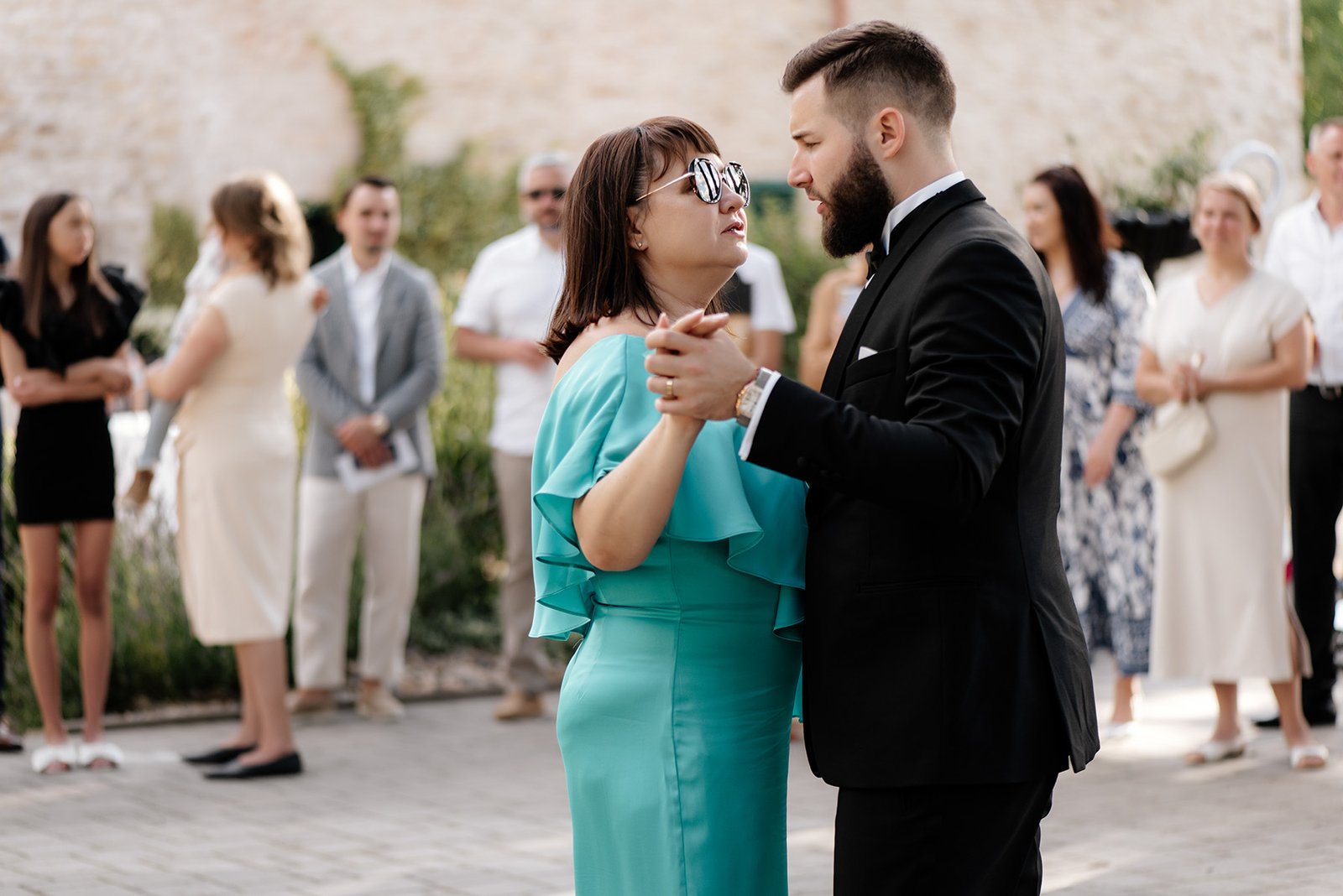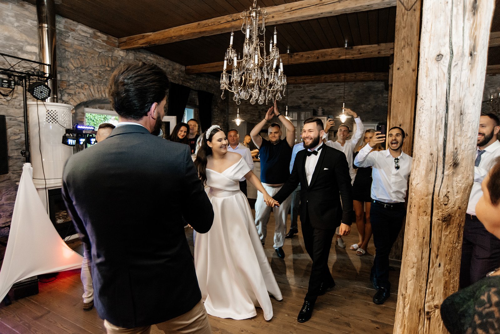 Po pierwszym tańcu Kristiny i Davida, nadszedł czas na kolejne wzruszające chwile. David zaprosił swoją mamę na parkiet, a Kristina ujęła za rękę swojego ojca, by wspólnie zatańczyć w tym wyjątkowym dniu. Był to moment pełen emocji, kiedy rodzice dzielili się radością z dziećmi, a goście obserwowali ten wzruszający gest z uśmiechami na twarzach. Po chwili do pary dołączyli wszyscy goście, tworząc radosną atmosferę na parkiecie. Tańczyli razem, śmiejąc się i ciesząc się każdą chwilą, a cała sala rozbłysła energią i radością, tworząc niezapomnianą atmosferę na zakończenie tej pięknej nocy.