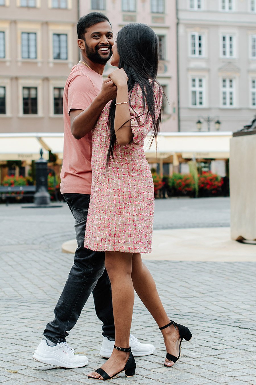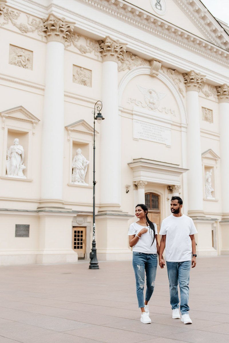 Warszawska starówka to jedno z najbardziej malowniczych miejsc w Polsce. Wąskie brukowane uliczki, urokliwe kamienice i zabytkowe kościoły tworzyły idealne tło dla romantycznej sesji. Swathi i Madhu spacerowali po rynku, zatrzymując się przy kolorowych fasadach budynków oraz na tle majestatycznego Zamku Królewskiego. Ciepłe, złote światło zachodącego słońca dodawało kadrom magii i podkreślało ich bliskość.